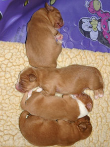 Litters are whelped in our home. We handle the puppies daily. We practice the early neurological stimulation techniques advocated by Dr. Carmen L. Battaglia. From four weeks on there is a steady influx of visitors. Friends, neighbors and people on our waiting list are encouraged to visit and interact with the puppies. In fact, from about six weeks on until the time they leave for their new homes, we are actively lining up folks to come over and help us wear out the puppies. Our puppies are exposed to new sights and sounds daily including duck wings and the great outdoors.